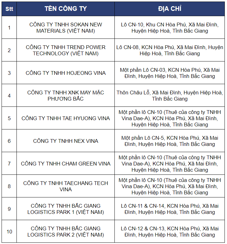 - Tên: Khu công nghiệp Hòa Phú, huyện Hiệp Hòa, tỉnh Bắc Giang