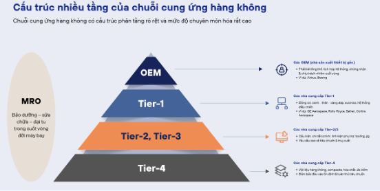 Chuỗi cung ứng hàng không có cấu trúc phân tầng rõ rệt và mức độ chuyên môn hóa rất cao, trải dài từ thiết kế - sản xuất - lắp ráp cho đến vận hành, bảo dưỡng và hỗ trợ kỹ thuật trong suốt vòng đời khai thác của máy bay.