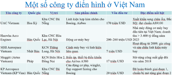 Ở mảng sản xuất linh kiện và gia công cơ khí chính xác, thị trường hiện có sự tham gia của cả doanh nghiệp nội địa và FDI. Một số tên tuổi đáng chú ý gồm Viettel Manufacturing Corporation (VMC), UAC Vietnam và Hanwha Aerospace Vietnam. Các doanh nghiệp này tham gia vào gia công chi tiết cấu trúc, linh kiện nhôm - titan, tooling và jig phục vụ các đơn hàng chọn lọc trong chuỗi cung ứng quốc tế.